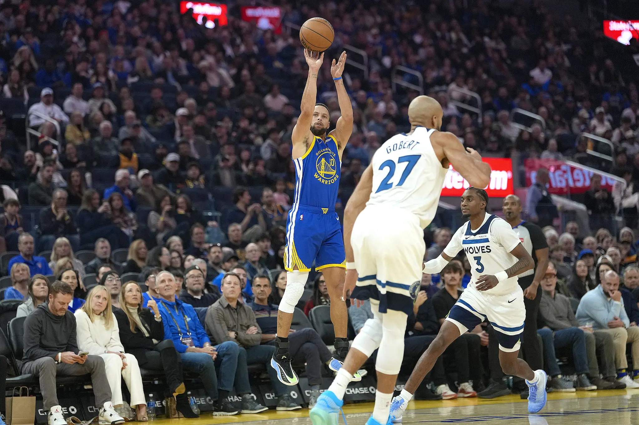 最后3分多钟,库里连续点飞迪文琴佐和戈贝尔,轰进三分点燃球馆,爱德华兹咧嘴大笑引热议,之后库里无视兰德尔再中三分,穆迪反击得分,迪文琴佐三分止血,库里造犯规两罚一中,戈贝尔再次隔扣,波斯特错失空位三分,里德两罚一中,库里撤步三分不中,27.4秒迪文琴佐制胜三分,最终勇士主场惜败。